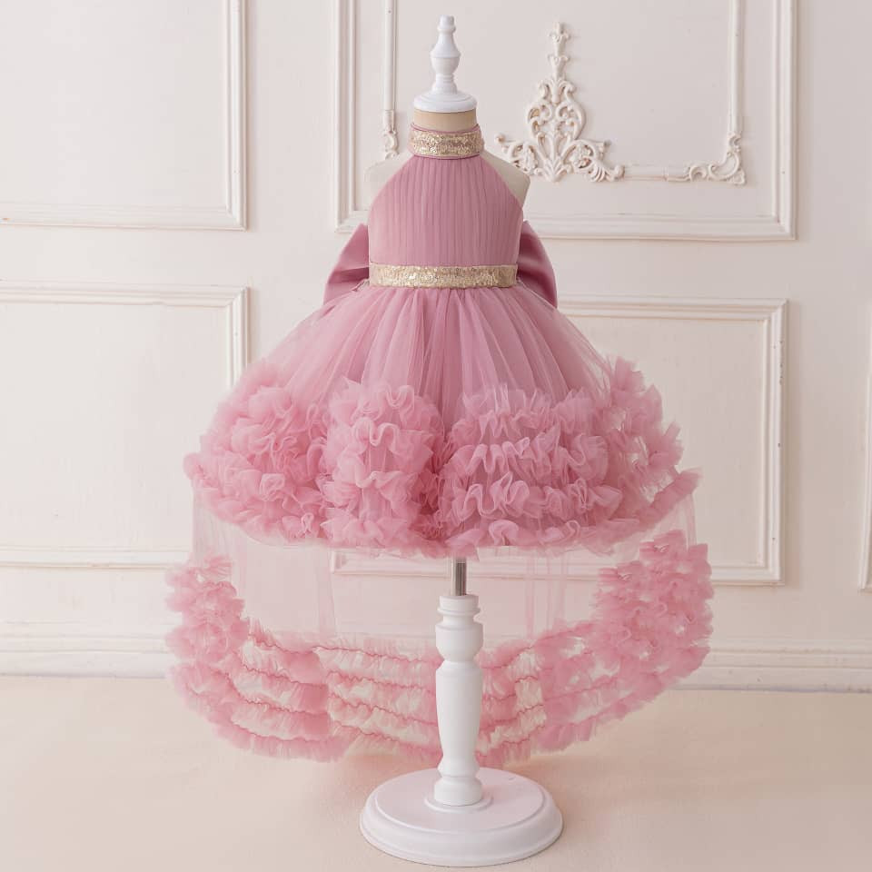 Rochie elegantă pentru fetițe 0-4 ani – roz pudră cu paiete aurii și trenă detașabilă