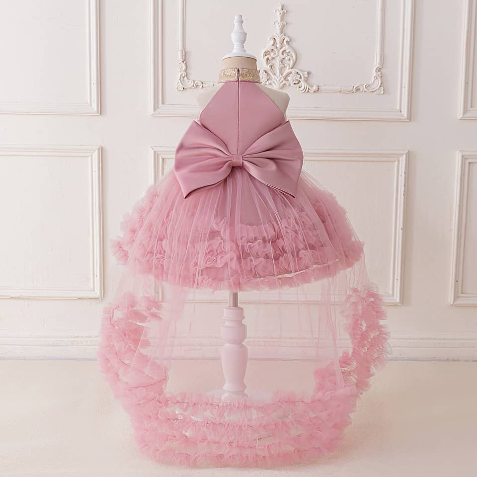 Această rochie elegantă pentru fetițe cu vârsta între 0 și 4 ani este alegerea ideală pentru momente speciale. Realizată într-o nuanță delicată de roz pudră, rochia are o croială până la genunchi și este accesorizată cu o trenă detașabilă, ce oferă un efect spectaculos și rafinat.