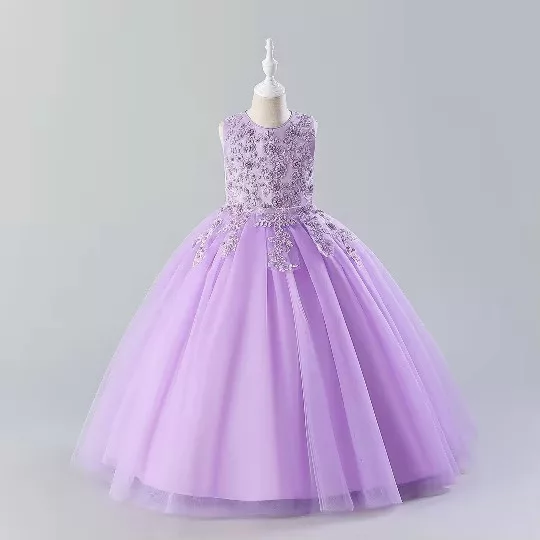 Rochiță elegantă mov pentru fetițe, ideală pentru ocazii speciale precum nuntă, botez, serbare, banchet sau petrecere. Model de rochiță lungă, fără mâneci, realizată din tulle fin și broderie delicată, cu căptușeală din bumbac moale pentru confort maxim. Rochia are fermoar ascuns la spate și cordon reglabil care permite ajustarea taliei. Designul rafinat și culoarea intensă o transformă într-o alegere perfectă pentru micile domnișoare care iubesc eleganța.