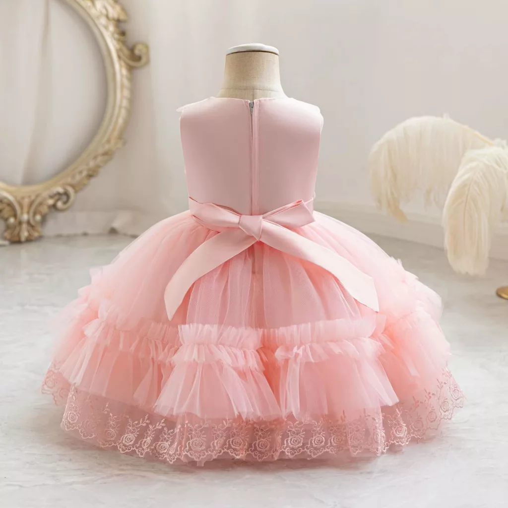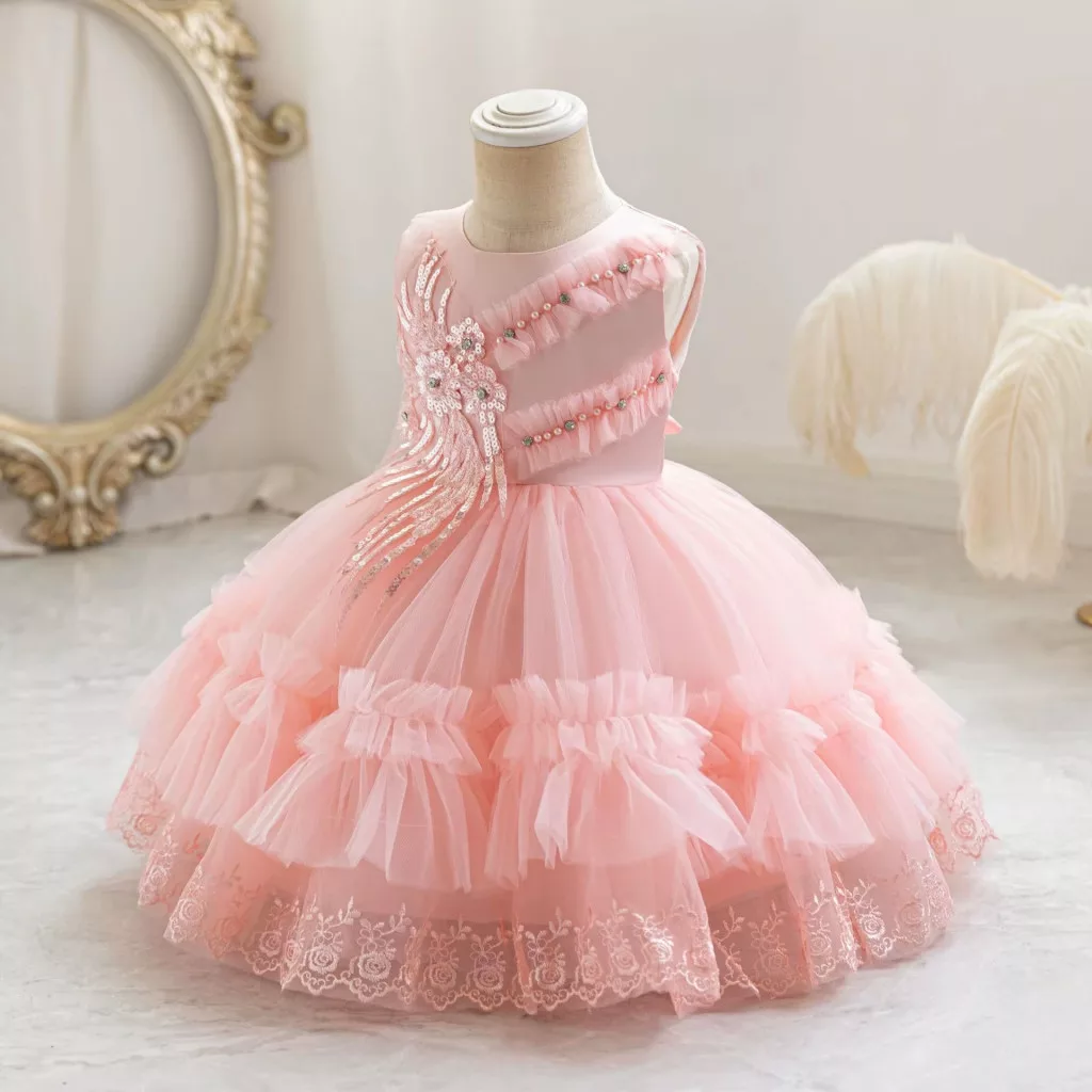 Această rochie elegantă pentru fetițe cu vârste între 0 și 4 ani este alegerea perfectă pentru ocazii speciale. Realizată într-o nuanță delicată de roz deschis, rochia combină paietele strălucitoare cu broderia atent lucrată, tulle-ul vaporos și inserțiile de dantelă fină, creând un design deosebit și rafinat.