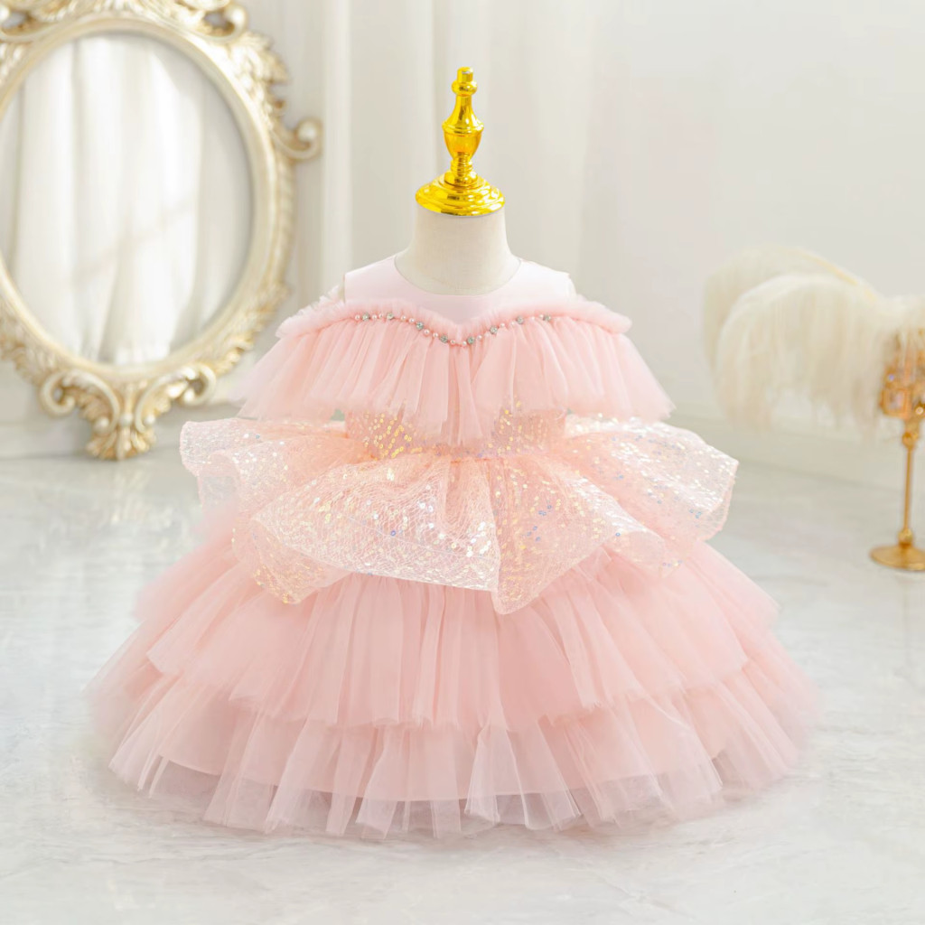 Culoarea roz deschis și detaliile strălucitoare creează o ținută festivă ideală pentru zile de naștere.