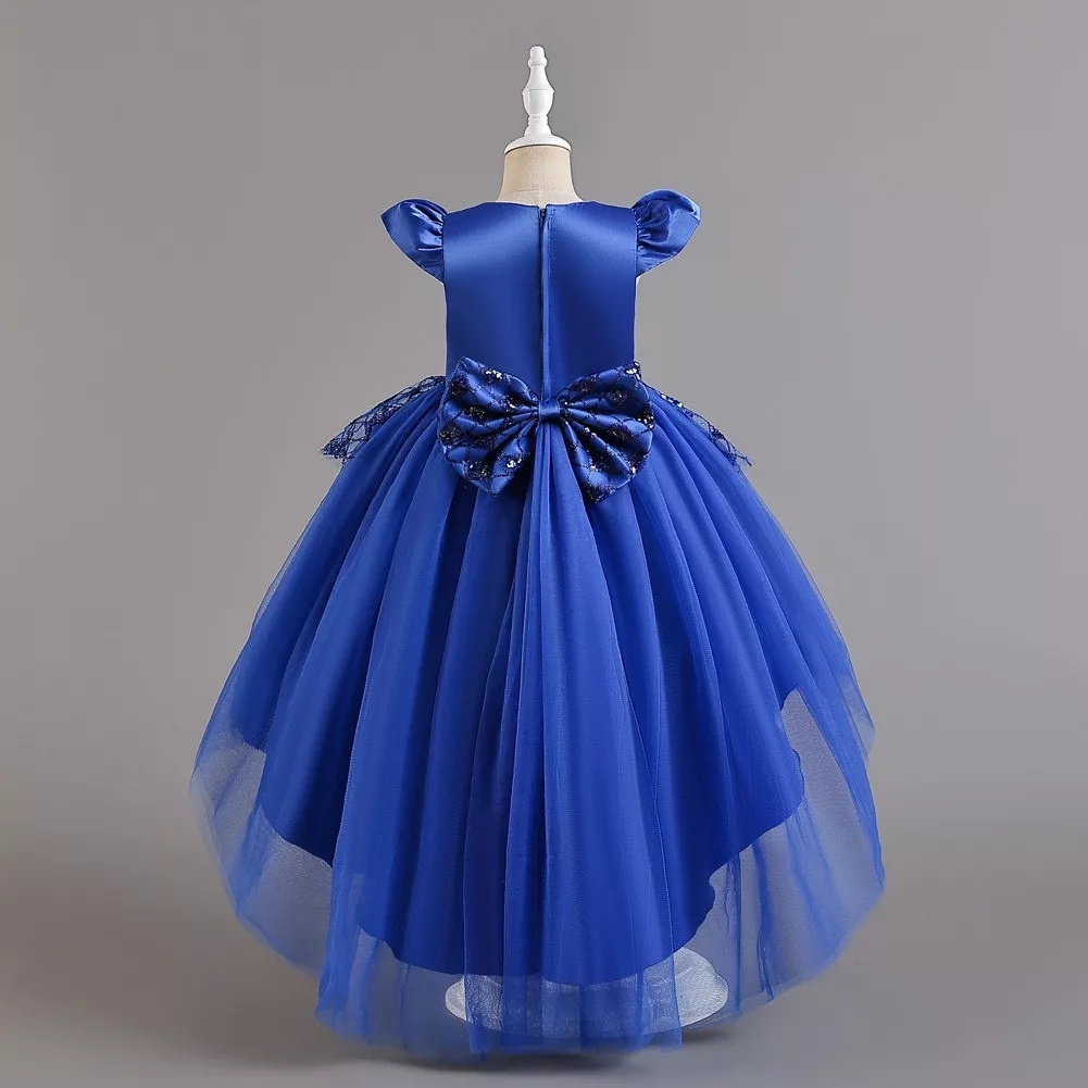 Rochia elegantă pentru fete, în nuanța intensă de albastru electric, cu trena și funda delicată la spate, este o alegere deosebită pentru evenimente speciale. Designul cu paiete și peplum aduce un plus de rafinament, transformând orice moment într-o ocazie de neuitat.