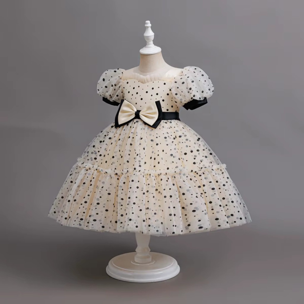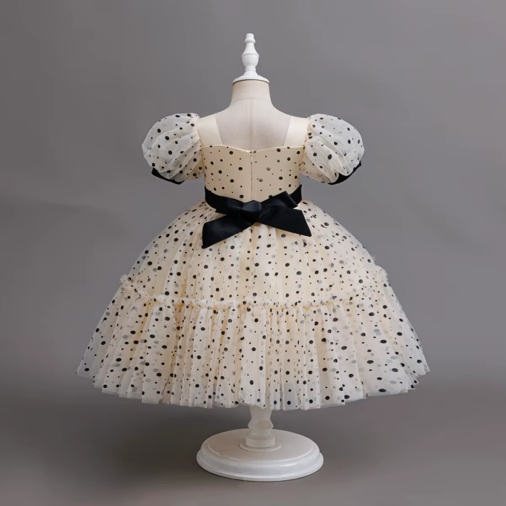 Îmbracă-ți fetița într-o rochiță delicată și fermecătoare, perfectă pentru orice ocazie specială. Rochița crem cu buline negre Stefana este creată pentru fetițe între 3 și 12 ani, combinând eleganța cu confortul de zi cu zi. Cu un design adorabil și detalii atent lucrate, aceasta va fi alegerea ideală pentru aniversări, serbări, banchete, nunți, botezuri, baluri sau concursuri de modă.