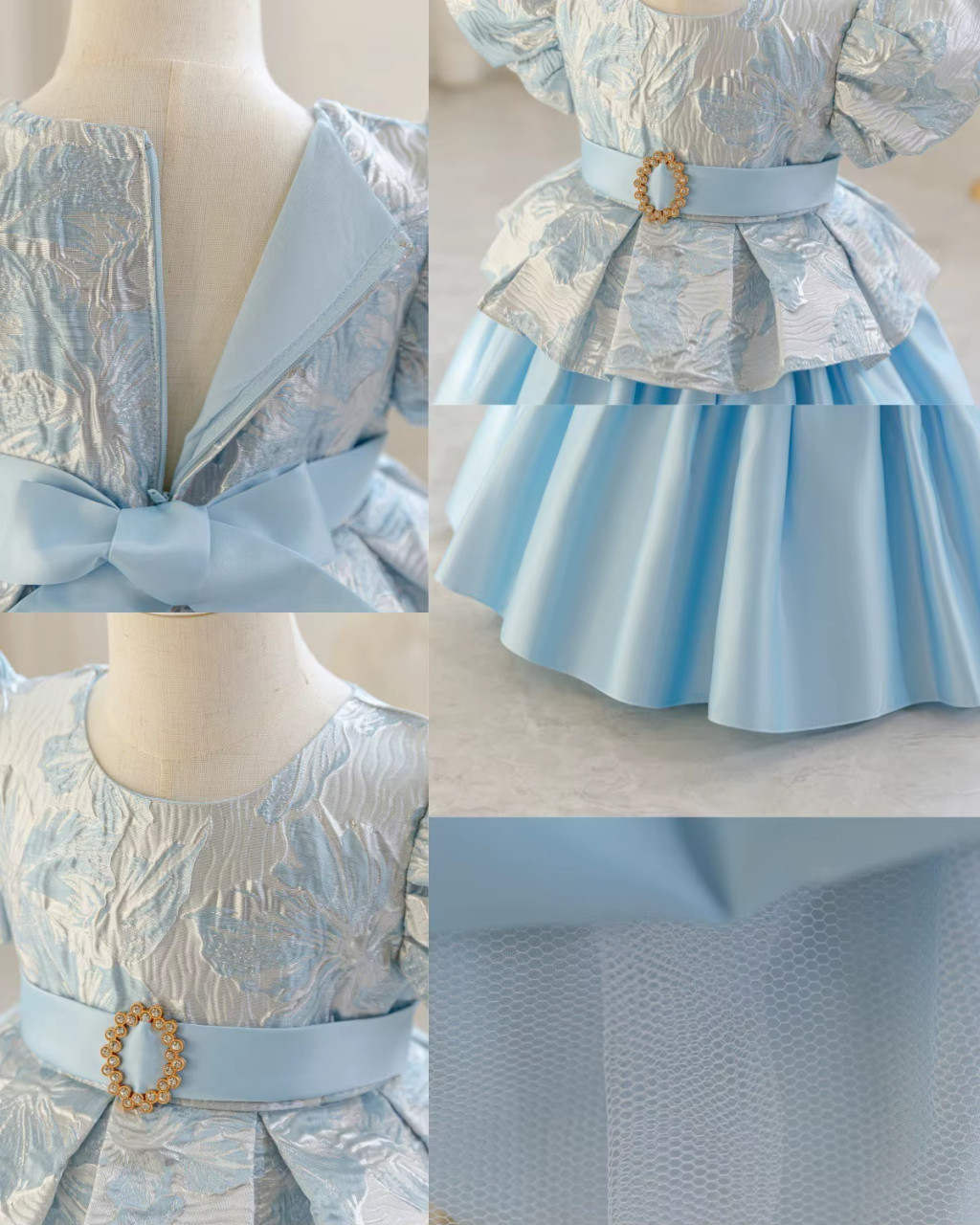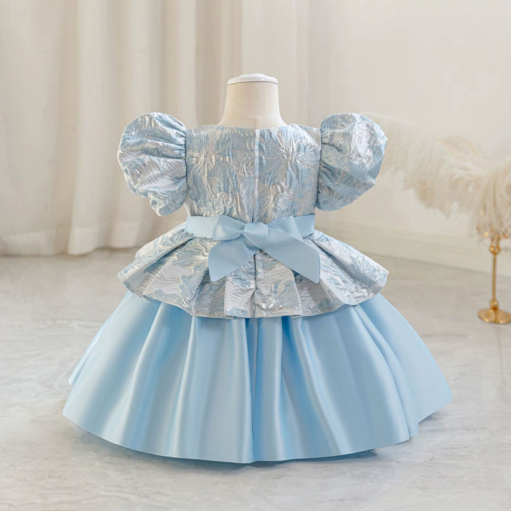 Realizată din tafta de calitate superioară, cu bumbac delicat la interior, rochița oferă un echilibru perfect între eleganță și confort. Croiala cu peplum, mânecile scurte și nuanța delicată de albastru deschis transformă acest model într-o alegere ideală pentru botez, nuntă, aniversare, serbare, banchet sau concursuri de talente.