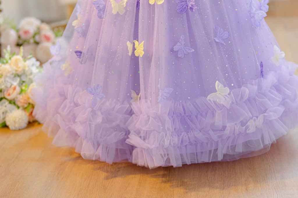 Un element decorativ aparte îl reprezintă aplicațiile cu fluturi, care adaugă un plus de farmec și transformă rochița într-o piesă de poveste.