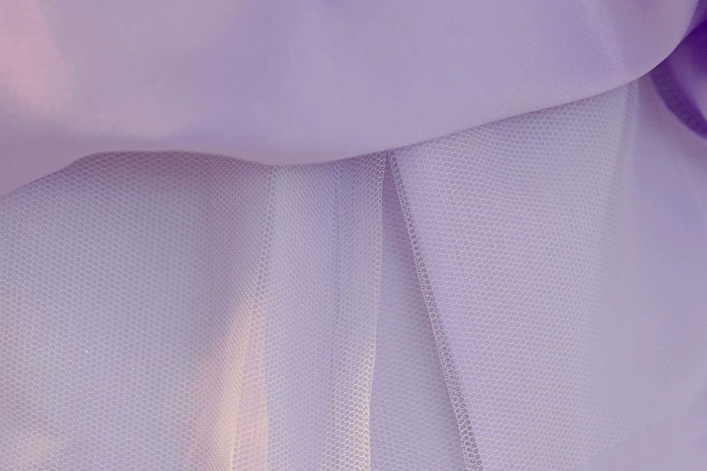 Rochița impresionează prin croiala sa lungă și fluidă, realizată din straturi fine de tulle care oferă volum și un aspect diafan. Nuanța de mov deschis adaugă o notă de delicatețe și rafinament, fiind potrivită pentru orice tip de eveniment festiv.