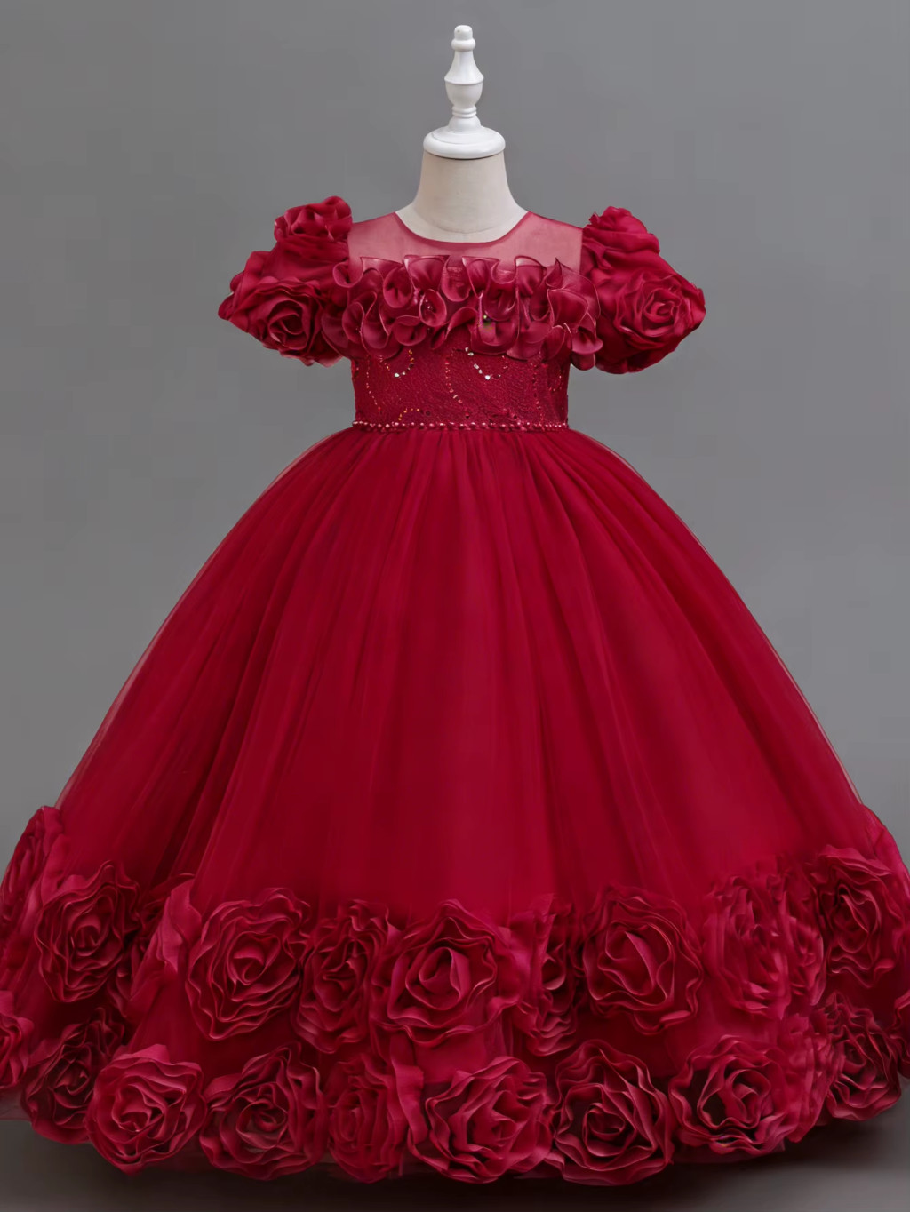 Trandafirii 3D și culoarea bordo oferă rochiei un aspect sofisticat și deosebit.